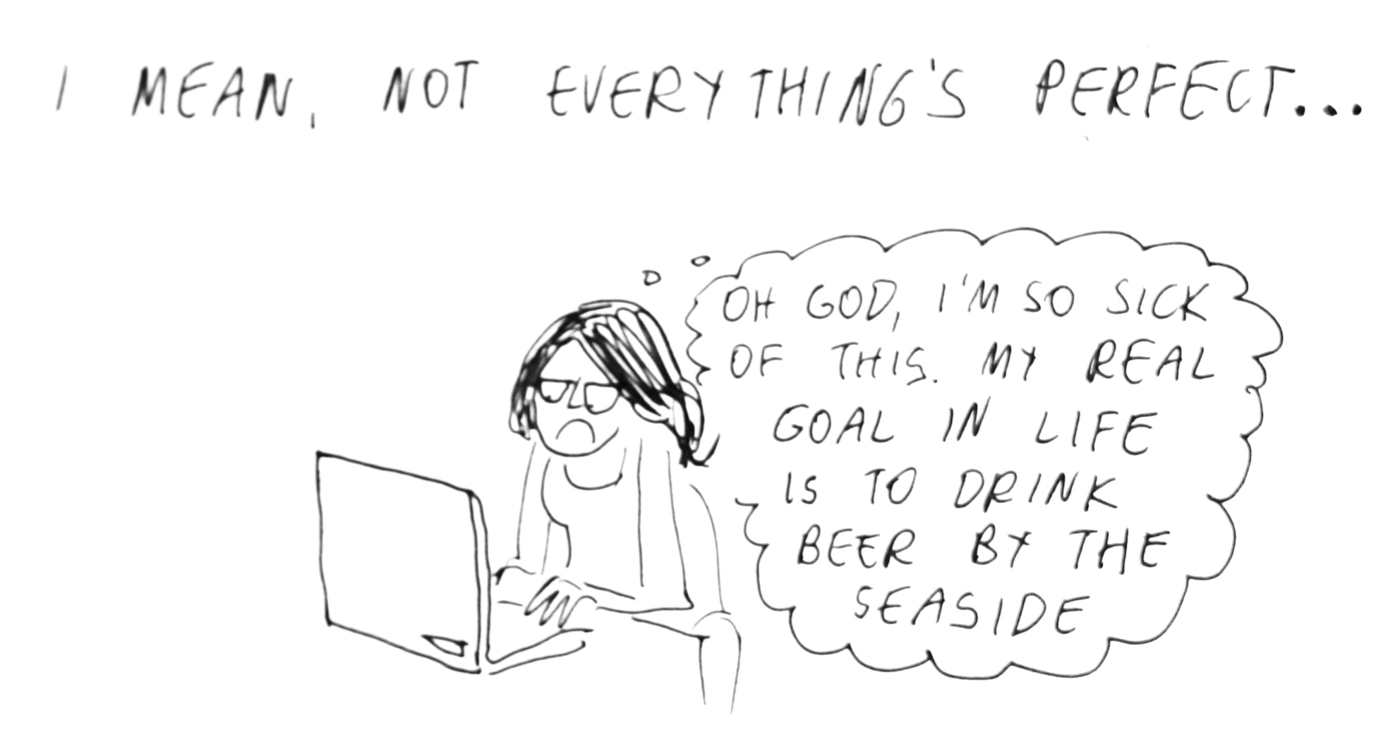 Eight years later I am finding this masterpiece. I also found that there are people around me who feel the same way I feel, especially my peers. I also want to write comics like you, but after my banking hours I get only like seven wake hours max per day. Still I am trying. By this time I hope your crisis period is over and you are doing what you always wanted to do. I also hope that you are drinking beer by seaside. (The last picture made me instantly happy by the way)